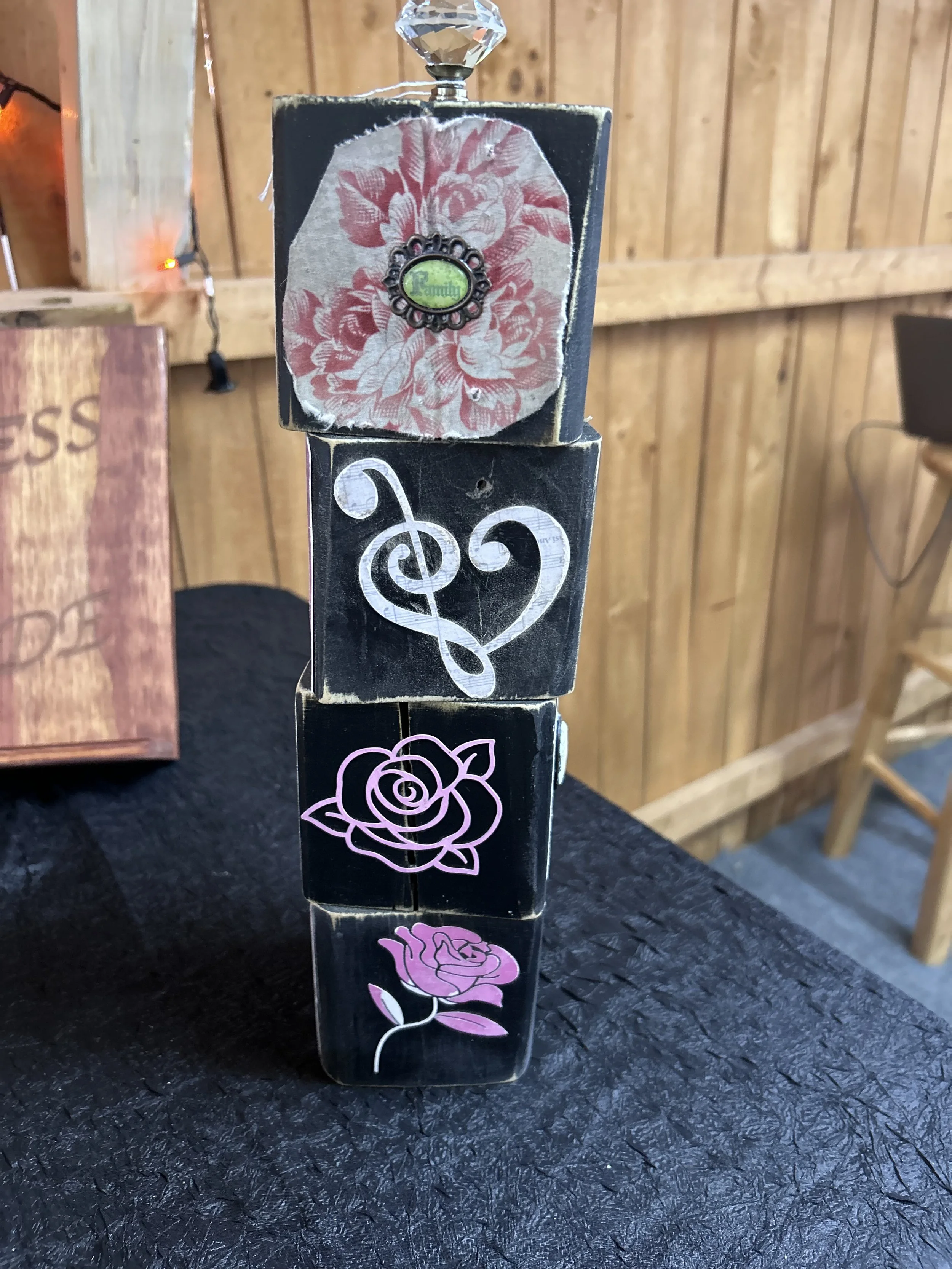 Spell out your feelings with this charming stack of decorative wooden blocks that spell "LOVE". Each rustic black block features a letter in a soft purple hue on two opposite sides. The other sides are uniquely embellished with delicate details like a lacy heart, a fabric heart with stripes, a burlap heart, and a decorative white fence design. A sparkly faux crystal knob sits atop the stack, adding a touch of whimsical elegance. Perfect for Valentine's Day, weddings, or simply to add a loving touch to your home decor.
